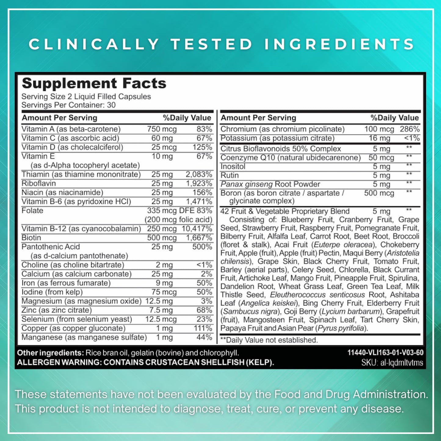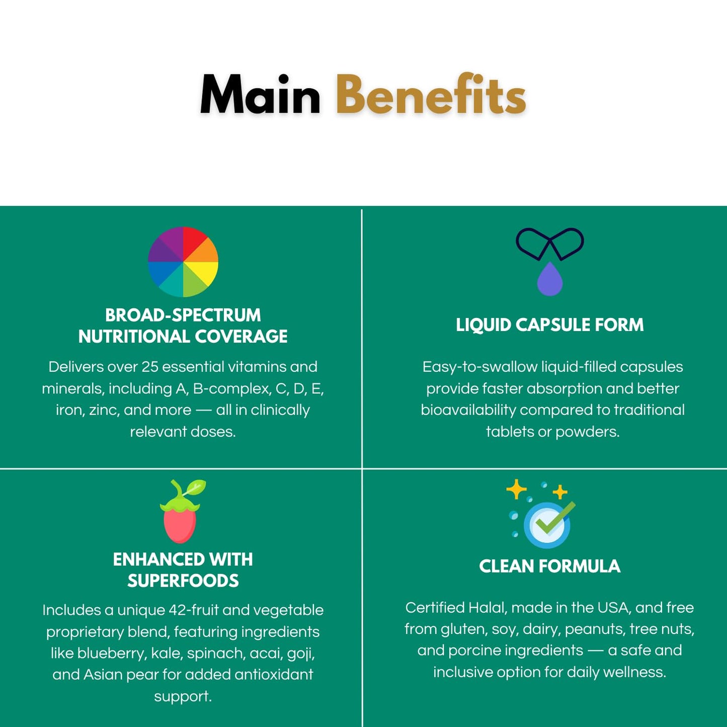 - Nutrición diaria completa con más de 25 vitaminas y minerales esenciales, incluyendo complejo B, C, D, E, zinc y más