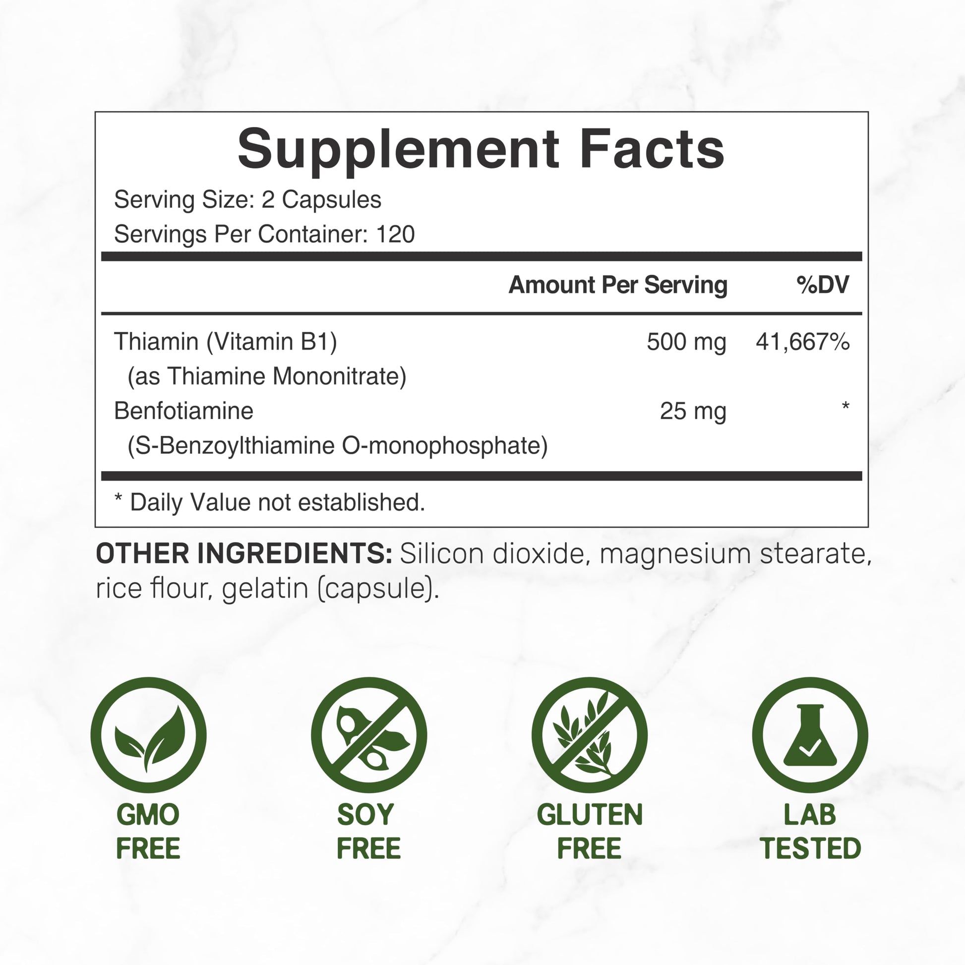 - 240 cápsulas por botella. Tamaño de dosis 2 cápsulas. Tiamina 500mg reforzada con benfotiamina 25mg. 120 porciones
