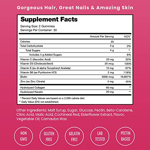 - Complejo de belleza completo: Con 5000mcg de biotina, 60mg de colágeno y 20mg de queratina, nuestras gomitas Biotina+ ofrecen la fórmula definitiva para apoyar piel radiante, uñas fuertes y cabello saludable.