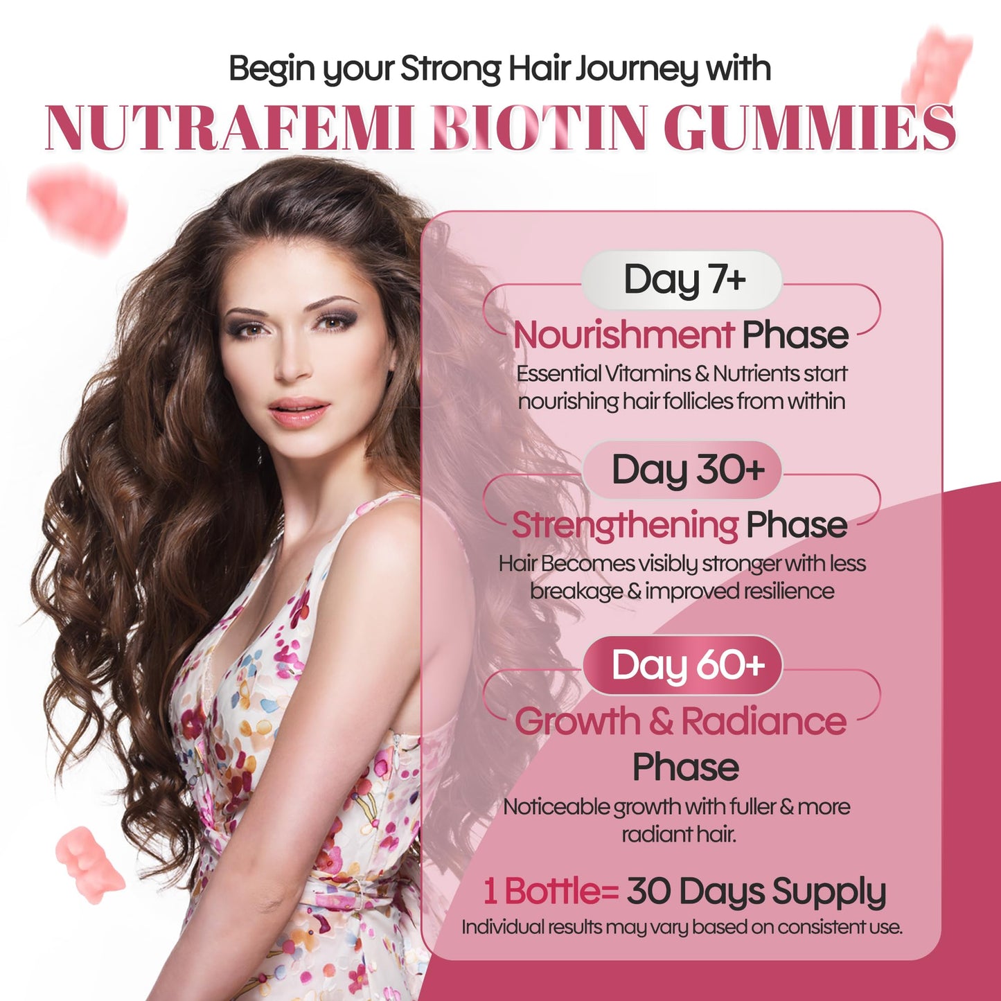 - Promueve cabello más fuerte y saludable Nuestras gomitas premium contienen nutrientes clave como Biotina, Vitamina C, Vitamina E y Ácido Fólico para apoyar el crecimiento del cabello, fortalecerlo y mejorar la vitalidad capilar desde adentro.