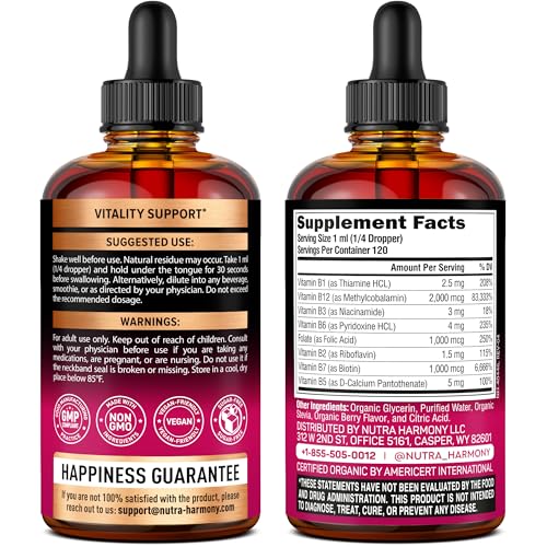 - Vitamina B Complejo Orgánica USDA Energiza y revitaliza con gotas líquidas premium orgánicas de vitamina B5 y B12 metilcobalamina. Diseñadas para incrementar niveles de energía y vitalidad diaria.