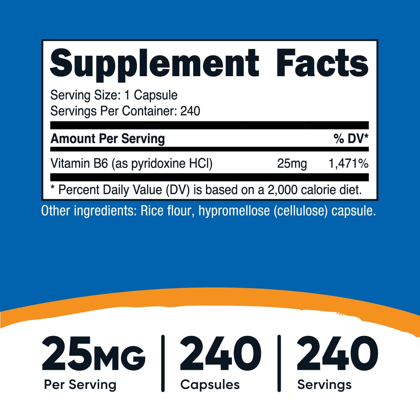 Nutricost Vitamina B6 25mg 240 Cápsulas No GMO Sin Gluten Vegetariano